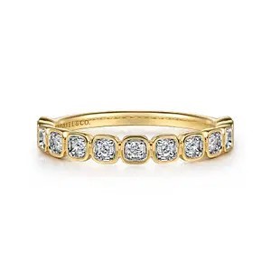 This wedding band has round diamonds widely spaced along the front of a high polished 14kt yellow gold front